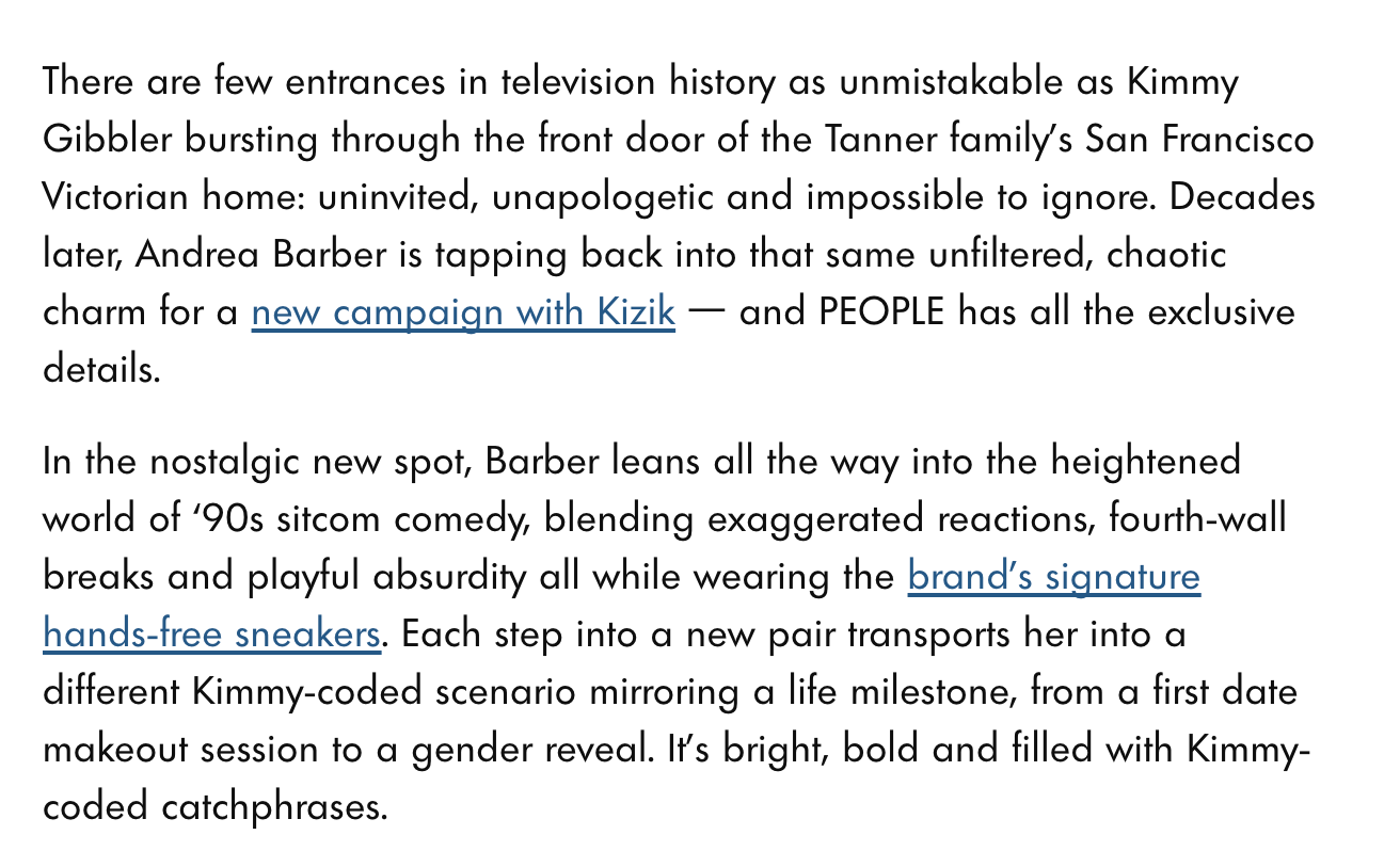 Millennials miss 90’s TV sitcom shows like Full House. So we had Andrea Barber step back into her iconic role as Kimmy Gibbler to tell the interwebs about Kizik hands-free shoes.
